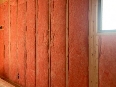 断熱工事。壁に断熱材をはめ込んでる様子です。