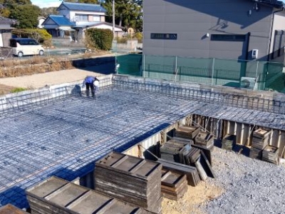 配筋工事を終えコンクリートを流し込みます。このように基礎は鉄筋とコンクリートでできています。コン...
