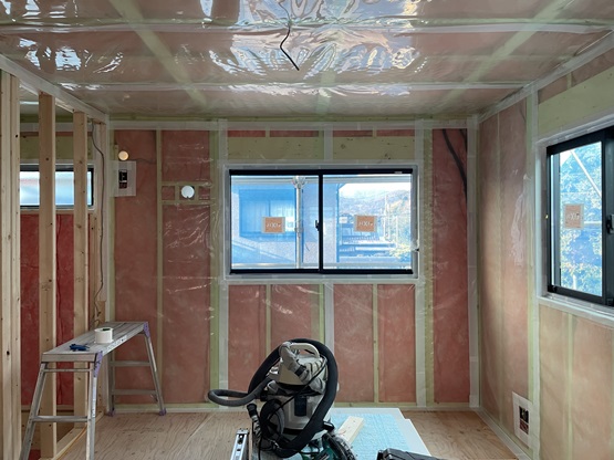 断熱材を施工します。厚さは9センチ。2×4の木材の厚み分しっかりと敷き詰めます。断熱性能は住み始めてからの省エネ性にかかわってくる部分。断熱性をしっかりしても隙間が多いと、その隙間から空気が行き来してしまうため意味がありません。隙間を埋める作業も丁寧に行います。