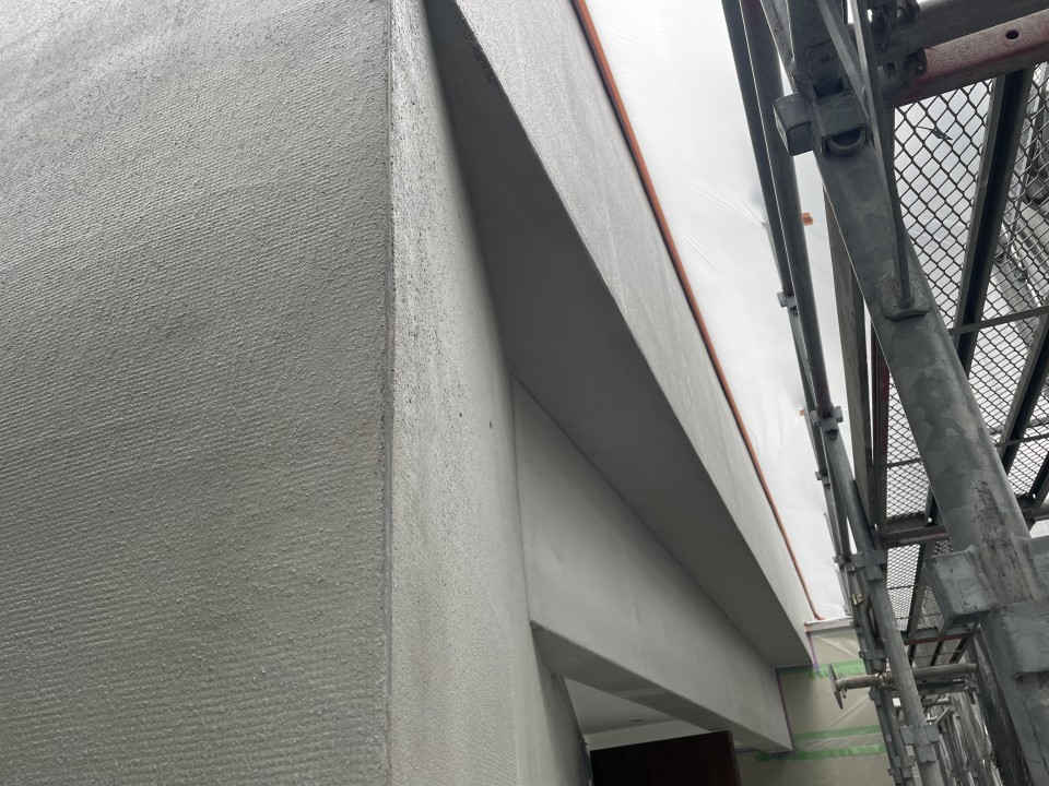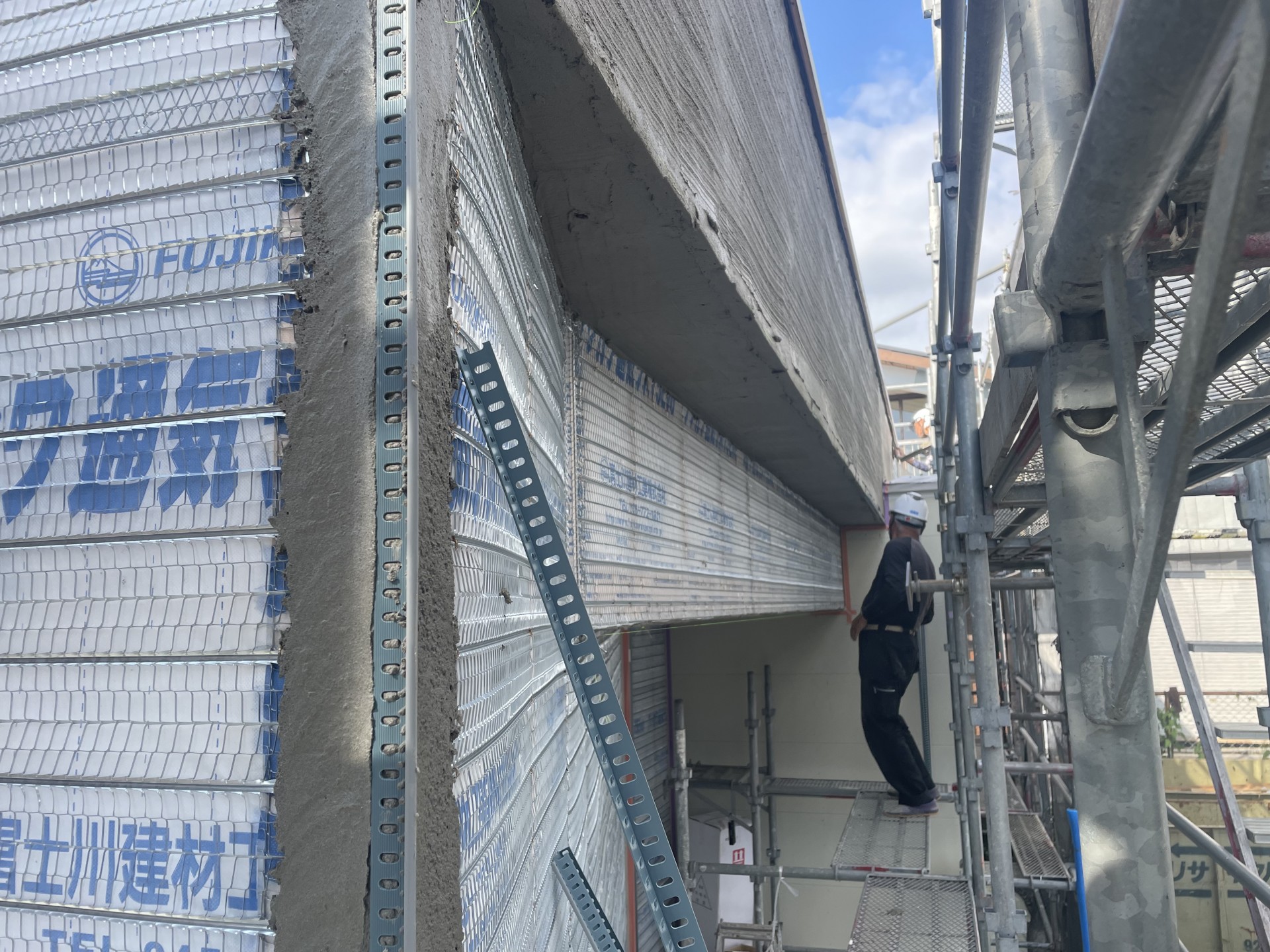 モルタルの下地が整うことで、建物の表情が一気に引き締まり、仕上がりのイメージも見えてきました。