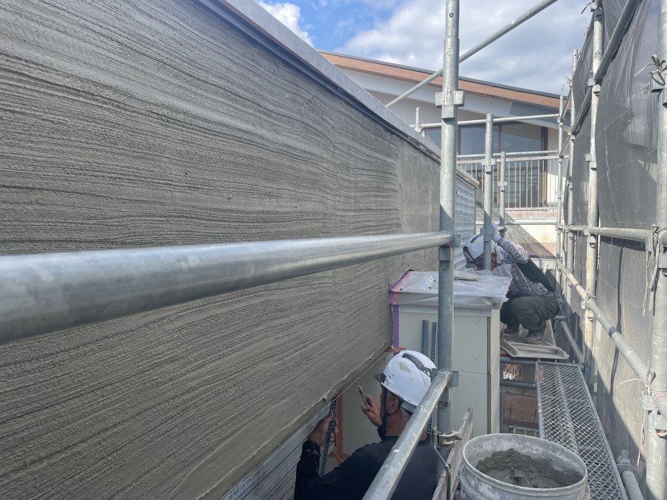 現在、外壁のモルタル塗りが行われており、職人さんが一面ずつ丁寧に仕上げています。