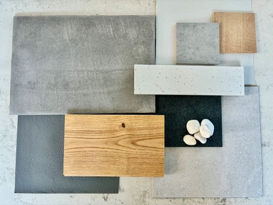 床はチェスナットの無垢材。キッチンや階段、玄関土間にはグレー。主張しすぎない色で、人や音、暮らしの動きが主役になる空間です。ながく好きでいられることを大切にしました。