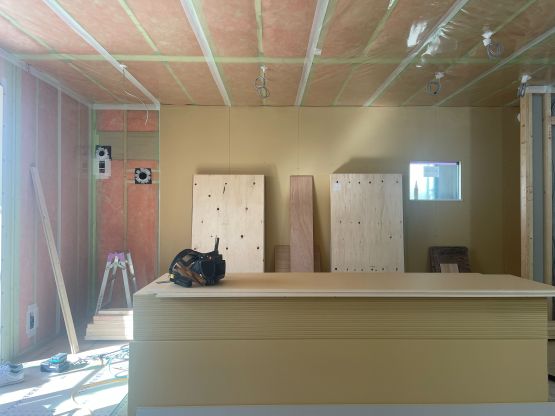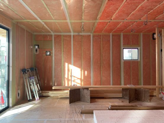 室内側にプラスターボードが貼られていきます。壁の中の様子がみえるのはここまで。