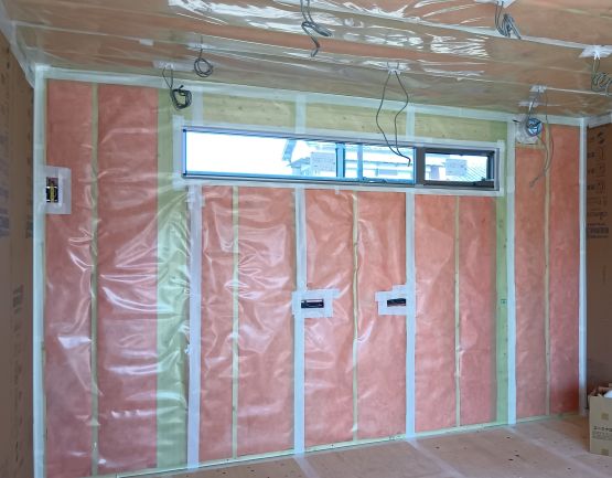 唯一のデメリットに関しては、断熱材施工後に断熱材の上から湿気を通さない防湿フィルムを貼ることで対処していきます。