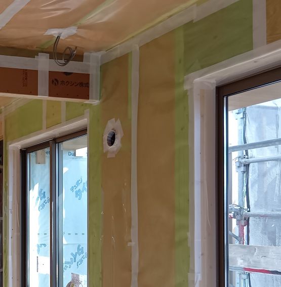 壁、天井はもちろん、細かな部分でサッシ廻り、コンセント、給気口、レンジフードの排気口なども丁寧に気密処理をしていきます。