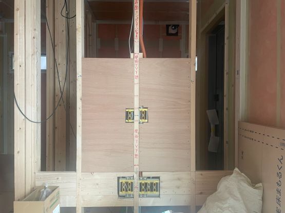 テレビは重量があるため、石膏ボードだけで支えることはできません。構造材の間に合板を入れて補強することでしっかり固定できるようになります。