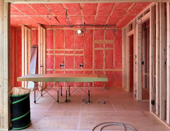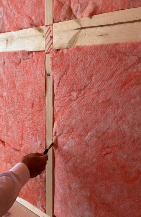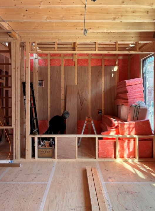壁にはめ込まれているピンクのものが断熱材、高性能グラスウールです。