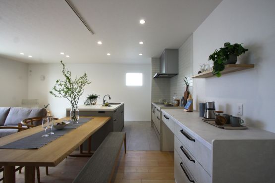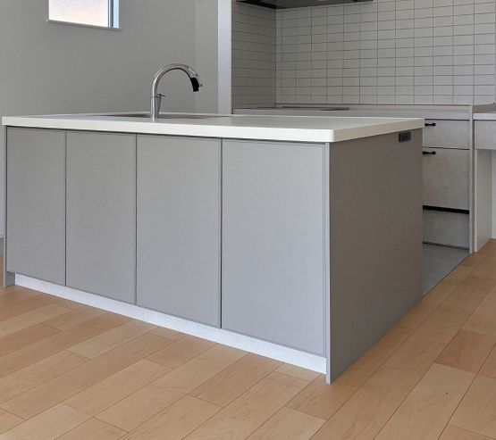形はⅡ型キッチン。Ⅱ型とはシンクを対面側に、コンロをカップボード側に配置した2列型キッチンのこと。省スペースにでき、作業台が2か所になるためご家族みんなでお料理なんてことも可能に!