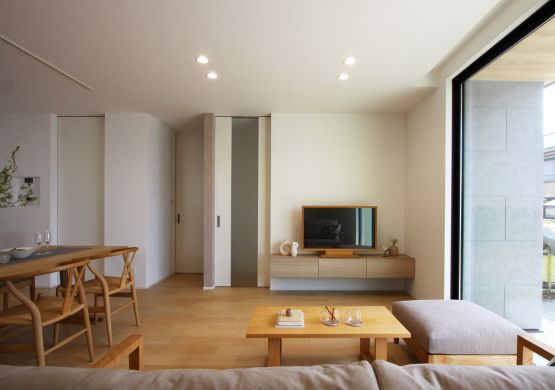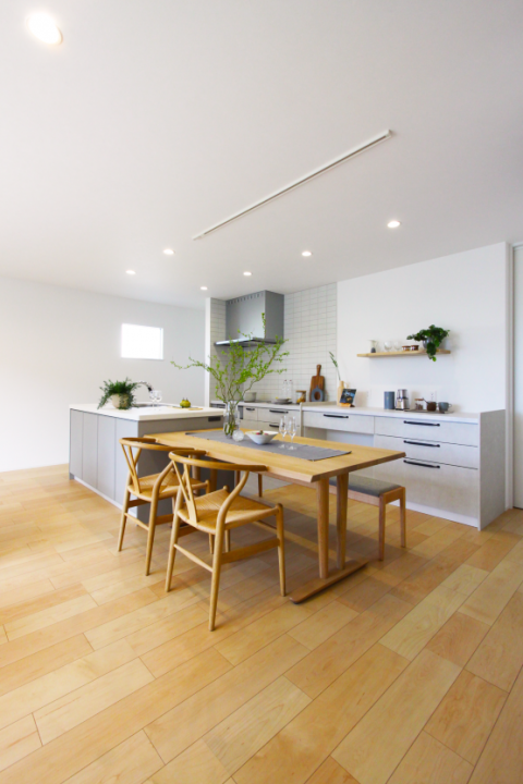 『ニュアンスカラーにメープルの床材が映える家』
