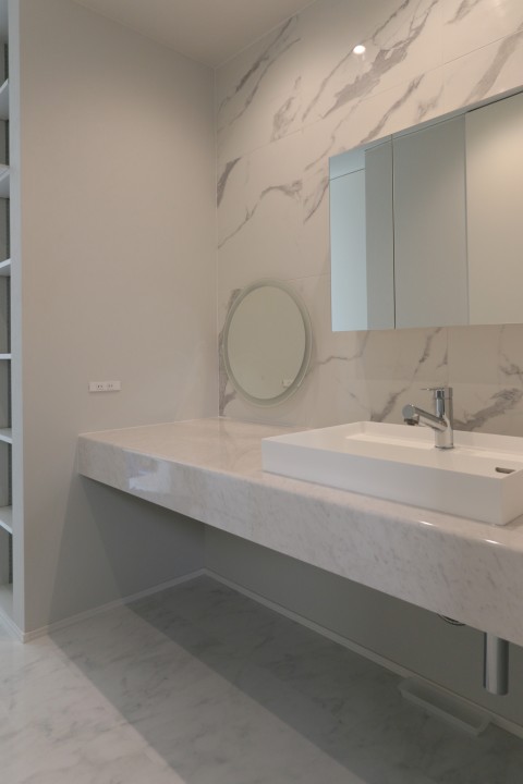 洗面空間には丸型ミラーと収納付きミラーを組み合わせ、機能性とデザイン性を高いレベルで両立。