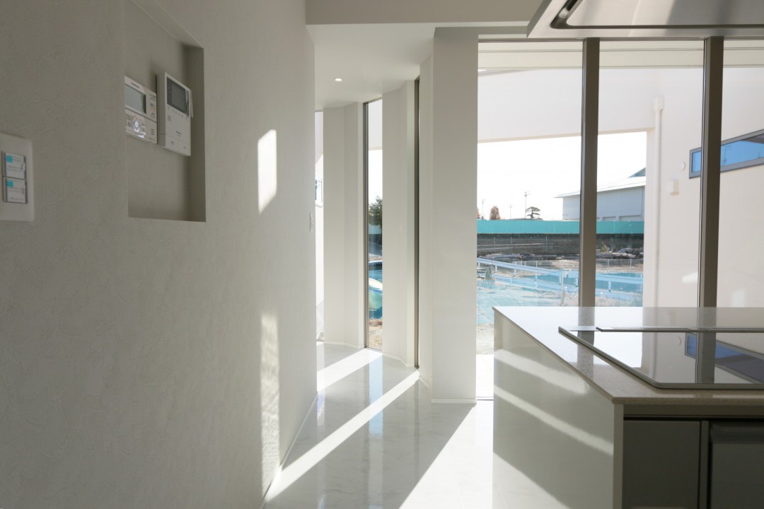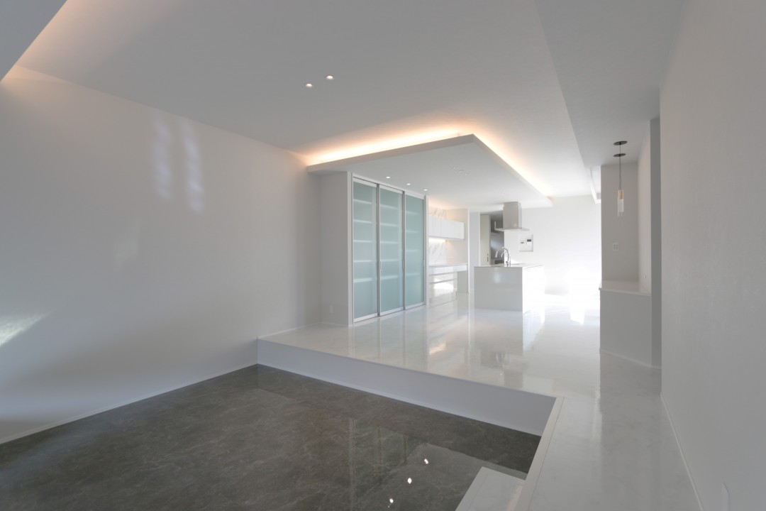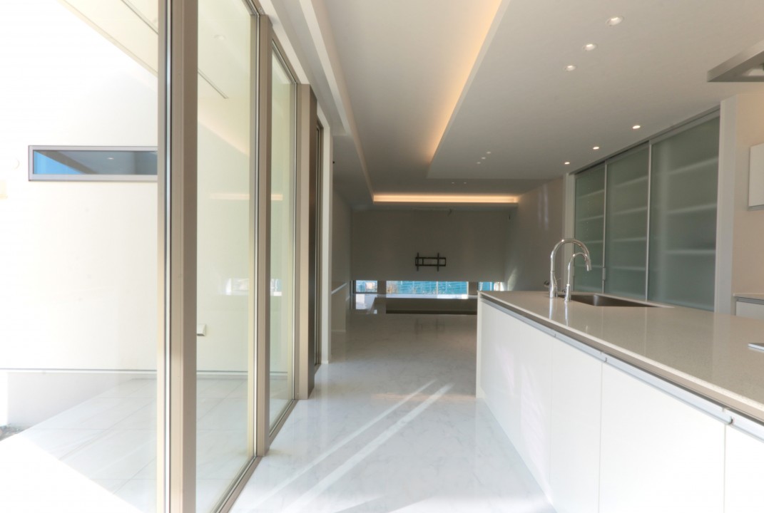 白を基調とした上質な空間に、中庭からの柔らかな光が溶け込み、LDK全体にラグジュアリーな雰囲気をもたらします。