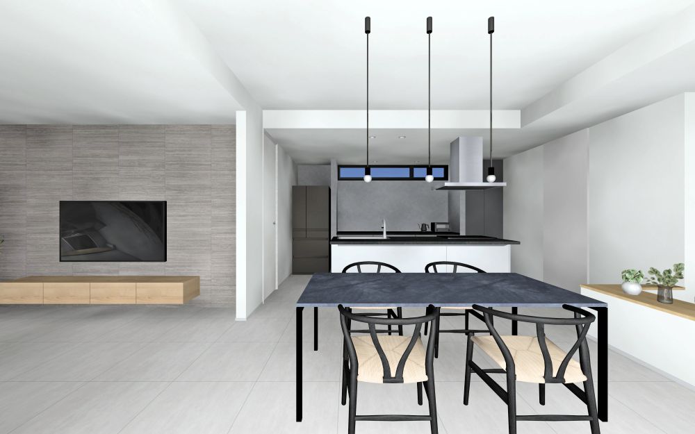 淡いグレージュのフロアタイルをベースにブラックで空間を引き締めたリゾートホテルのようなインテリア。